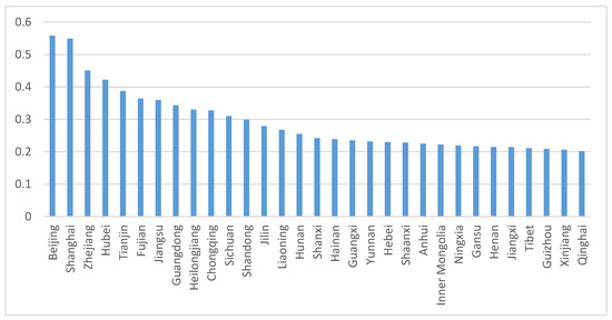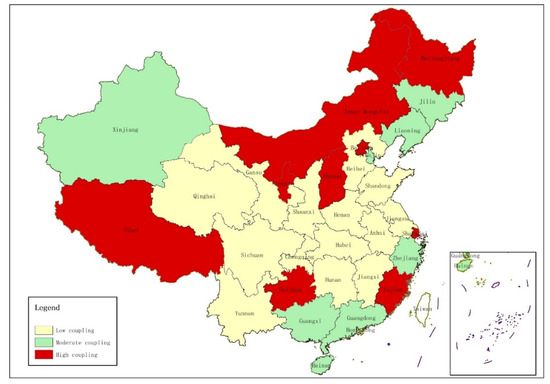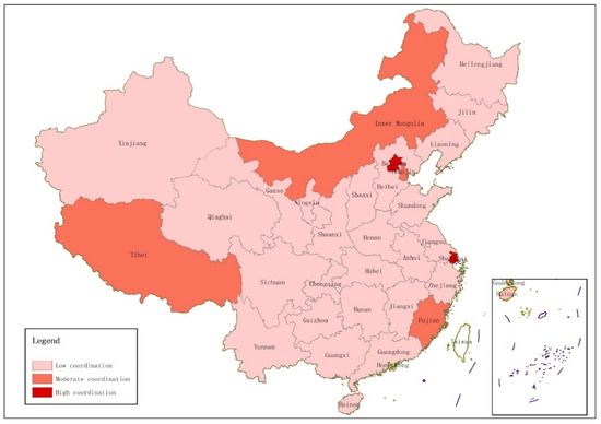 First, the coupling coordination degree of provinces, municipalities, and autonomous regions in China was averaged from 2010 to 2019. Then, according to the ranking of coupling coordination degree, the average coupling coordination degree was classified, as presented in Table 7 and Figure 5.