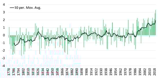 The most significant changes in air temperature in the Curonian Spit occurred between the outskirts of the 18th–19th and 20th–21st centuries. During these times, the air temperature increases noticeably. There were nearly 200 years between these two periods, during which the average annual air temperature increased only slightly. Substantial weather warming has occurred over the past 30 years. The annual average air temperature as well as the growing-season air temperature have increased. However, the most significant increase was observed in the average temperature norm of the summer—as much as 1.3 °C. Such a substantial increase in air temperature may have influenced plant succession.