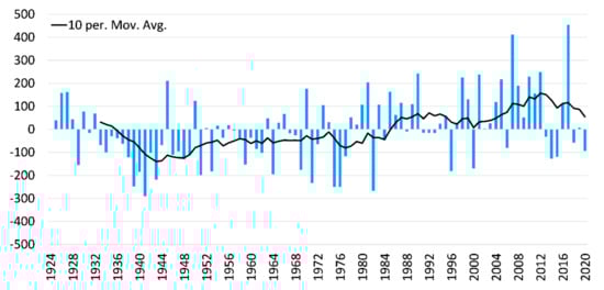 The average annual Baltic Sea level increased by 14 cm from the beginning until the third decade of the 20th century (Table 1). The most significant rise in the level of the Baltic Sea began in the 1980s (Table 1, Figure 4). During this time, sea levels increased at a rate of about 0.17 cm per year, whereas it was nearly twice as slow at the beginning of the century. The water level in the Baltic Sea decreased by about 0.16 cm per year in the middle of the 20th century (1930–1950). (Figure 4).