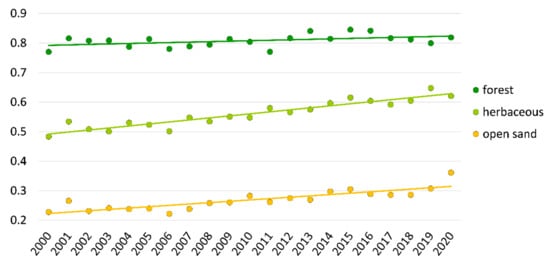 Average annual NDVI in forest, herbaceous, and open-sand ecosystems of the Curonian Spit during the growing seasons from 2000 to 2020.