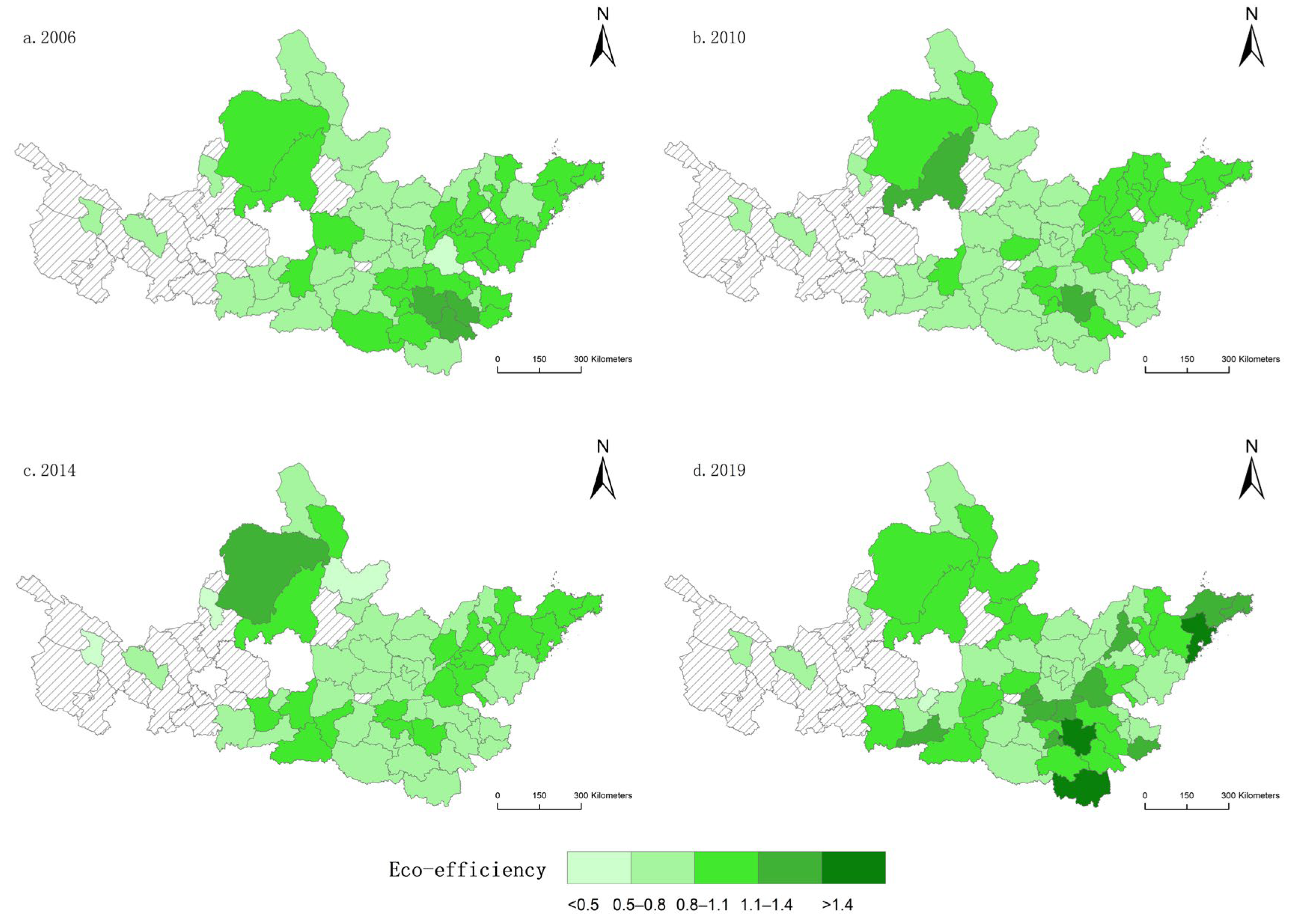 Spatial patterns of ecological efficiency in (a) 2006, (b) 2010, (c) 2014, and (d) 2019 in the Yellow River basin, China.