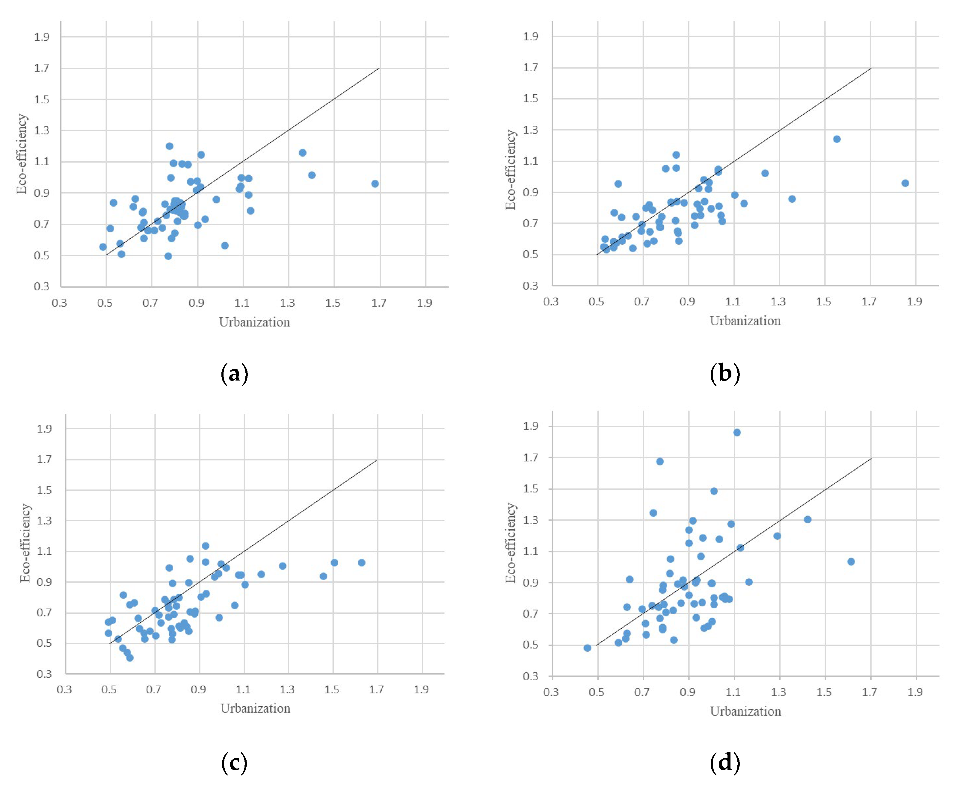 Firstly, the urbanization efficiency and ecological efficiency of 60 cities in the Yellow River basin, China, were analyzed in four stages, and the scattered coupling distribution map of the 60 cities was plotted (Figure 7). The expression of the straight line in the figure is y = x, that is, the line compares the urbanization efficiency and ecological efficiency of the 60 cities. If the point representing the 60 cities falls on the straight line of y = x, it indicates that the urbanization efficiency and ecological efficiency of the city are balanced. If the point representing the 60 cities falls above the line of y = x, indicating that the urbanization efficiency of the city is lower than the ecological efficiency and the development of urbanization in the city lags behind its ecological environment construction, then the urbanization construction needs to be strengthened to adapt to the sustainable development of the ecological environment. If the point representing the 60 cities falls below the straight line of y = x, indicating that the urbanization efficiency of the city is higher than its ecological efficiency and the development of urbanization in the city is ahead of its ecological environment construction, then the ecological environment construction needs to be strengthened to adapt to the improvement of its urbanization level.