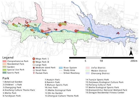The built-up area of Baoji in Shaanxi, China was selected as the study area, and the boundary was delineated based on Global Artificial Impervious Area (GAIA) data from Tsinghua University, including Weibin, Jintai, and Chencang Districts, with a total area of approximately 240.2 km2. The 19 selected urban parks were free and open to the public and were not closed for maintenance during field investigations in 2020 (Figure 1). With a total area of 641 hm2, the parks covered about 2.7% of the study area. More than half of the park area and more than one-third of parks themselves were adjacent to rivers, mountains, or plateaus in Baoji. However, according to the Statistical Yearbook of Urban Construction 2020 [36], there were 28 urban parks within the built-up area of Baoji, with an area of 920 hm2. To ensure data uniformity and comparability, the official statistical yearbook data were used for the comparative study of Baoji and other representative urban park systems at home and abroad.