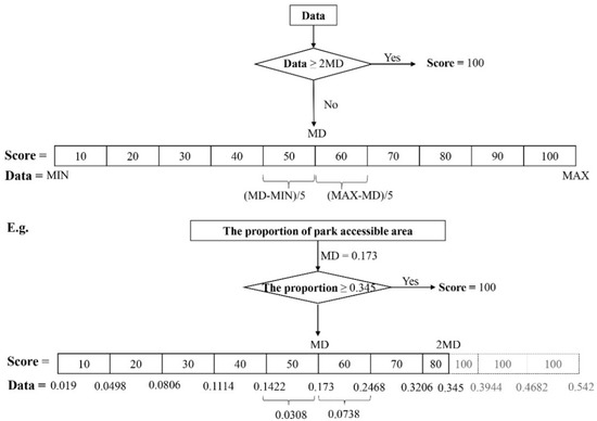 All indicators in the scoring system were given equal weight [29]. In principle, indicator data were sorted and divided into 10 parts in numerical order, and then assigned 10 to 100 points as appropriate. In practice, to avoid distortion of scoring caused by large variation in the raw data, the data between minimum and the median were assigned scores from 10 to 50, and the data between the median and maximum were from 60 to 100. An example of the scoring process was shown in Figure 2. Data exceeding twice the median were directly rated as the maximum score 100.