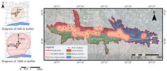 A buffer zone method was used to quantify the accessibility of urban parks. Two levels of buffer zones were established with a radius of 500 and 1000 m from the boundary of each park [40]. The 500 and 1000 m buffers are shown in Figure 3. The ratios of corresponding area and population within the buffer zones were used to measure park accessibility. The buffer zones were generated using ArcMap software, and population data were obtained from the Sixth China’s Population Census in 2010 (http://www.stats.gov.cn, accessed on 20 November 2021).