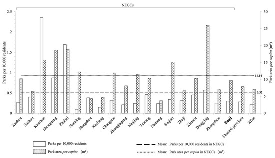 According to the aforementioned Statistical Yearbook of Urban Construction 2020, Baoji, the only NEGC in Shaanxi province, had 28 urban parks totaling 920 hm2, with 10 m2 park area per capita and about 0.3 parks per 10,000 residents. These values were higher than the average for Xi’an and Shaanxi Province (Figure 4). Among 19 NEGCs (i.e., Xuzhou, Suzhou, Kunshan, Shouguang, Zhuhai, Nanning, Hangzhou, Xuchang, Changshu, Zhangjiagang, Nanjing, Taicang, Nantong, Suqian, Zhuji, Xiamen, Dongying, Zhengzhou, and Baoji), Baoji ranked 12th in terms of park area per capita and parks per 10,000 residents, both of which were smaller than the overall mean.