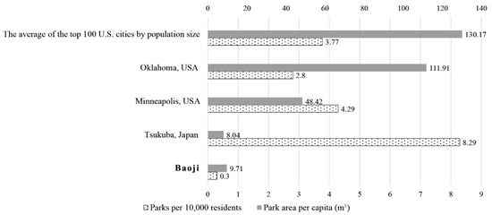 By comparison, by the end of 2020, there were 8.29 parks per 10,000 residents in Tsukuba, Japan, with about 8.04 m2 park area per capita (Figure 5). The top 100 cities in the United States by population size had 3.77 parks per 10,000 residents, and the park area per capita was about 130.17 m2. Minneapolis, which ranked first in the 2020 ParkScore rating results, had 4.29 parks per 10,000 residents and 48.42 m2 park area per capita. Oklahoma, which ranked last, has 2.8 parks per 10,000 residents and 111.91 m2 park area per capita. Except that the park area per capita in Tsukuba, Japan was slightly lower, the other data were greatly higher than that in Baoji.