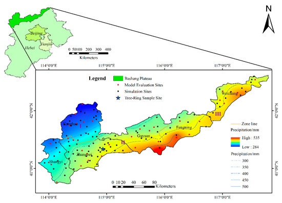 The Bashang Plateau, which is located between 114°35′~116°45′ E and 41°00′~42°20′ N, encompasses six counties (Guyuan, Zhangbei, Kangbao, Shangyi, Weichang, and Fengning) within the northern part of Hebei Province, China (Figure 1). It covers a total area of 18,202 km2 and has an elevation range of 831~2215 m. The Bashang Plateau is characterized by a continental monsoon climate that is cold, windy, and prone to drought. The mean annual precipitation (MAP) varies from 330 mm in the northwest to 460 mm in the southeast. The mean annual temperature (MAT) ranges from 1.5 to 5 °C, and the annual potential evaporation is approximately 880~1000 mm. The soil textures are mainly composed of clayey and sandy soils. The vegetation types in this area are warm temperate deciduous broadleaf forest and temperate grassland [22]. The Bashang Plateau is characterized by vulnerable ecosystems, and various non-native plant species (including Populus L., Ulmus pumila L., Pinus tabuliformis Carr., Pinus sylvestris var. mongolica Litv., Larix principis-rupprechtii Mayr., Betula platyphylla Suk., Caragana microphylla Lam. and Hippophae rhamnoides L.) have been introduced in this area in the efforts to restore vegetation. P. simonii, a fast-growing tree that was cultivated in the 1980s to promote ecological protection, was investigated in this study. Based on the geographical and ecological characteristics, we divided the Bashang Plateau into three subregions (Table 1).