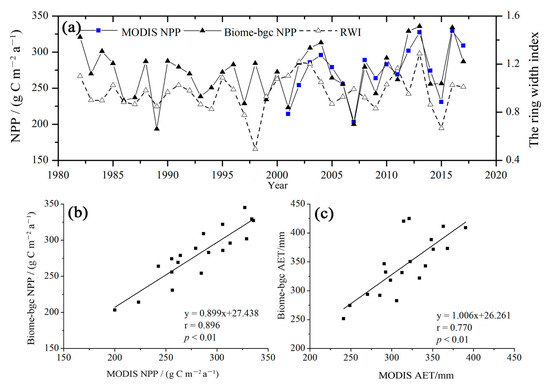 (a) Comparisons between the P. simonii forest NPP based on the Biome-BGC model and MODIS data for NPP and the tree-ring-width index (RWI) at the Zhangbei Ertai site during the period of 1982–2017; (b) comparisons between the P. simonii forest NPP based on the Biome-BGC model and MODIS data and (c) AET based on the Biome-BGC model and MODIS data at the Zhangbei Ertai sites during the period of 2001–2019.