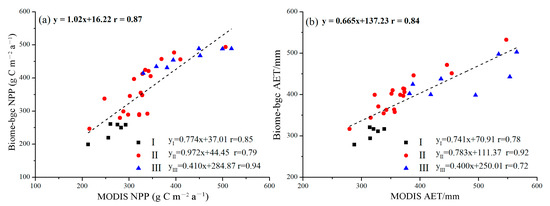 Comparisons of the Biome-BGC modeled (a) NPP, (b) AET and MODIS data for NPP and AET from 2001 to 2019 on the Bashang Plateau.