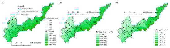 Spatial distribution of the mean (a) AET and (b) NPP and (c) maximum LAI for P. simonii forest on the Bashang Plateau during 1980–2019.
