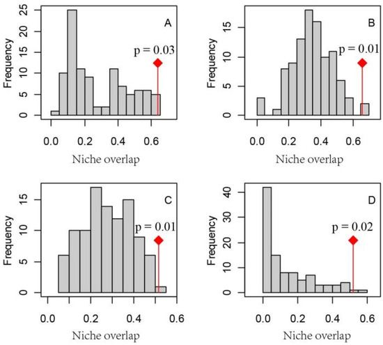 - Broennimann, Q.; Fitzpatrick, M.C.; Pearman, P.B.; Petitpierre, B.; Pellissier, L.; Yoccoz, N.G.; Thuiller, W.; Fortin, M.J.; Randin, C.; Zimmermann, N.E.; et al. Measuring ecological niche overlap from occurrence and spatial environmental data. Glob. Ecol. Biogeogr. 2012, 21, 481–497. [Google Scholar] [CrossRef]