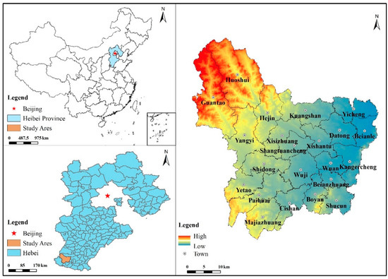Wu’an city is located in the southern part of Hebei Province in China (Figure 1), has a warm temperate continental monsoon climate, and covers 1818.05 km2. The local topography is high in the west and low in the east, with a hilly area only in the center with less sublime mountains, forming a small local plain. Wu’an city is a typical mining city with mining activities, and the mining resources have obvious regional distribution characteristics. Wu’an urban areas have iron ore resources to the north and south, coal resources to the east and west, and to the west and south, mainly limestone for cement, distributed around the railway. The key industries in the city are mineral mining and processing. The coal reserves in Wu’an are estimated at 2.3 billion metric tons and they produce 36 million metric tons of raw coal annually. The gross domestic product was USD 10.21 billion in 2018, of which the added value of secondary industry accounted for 58.48%; however, these industries also cause ecological destruction, such as ground collapse and fractures.
