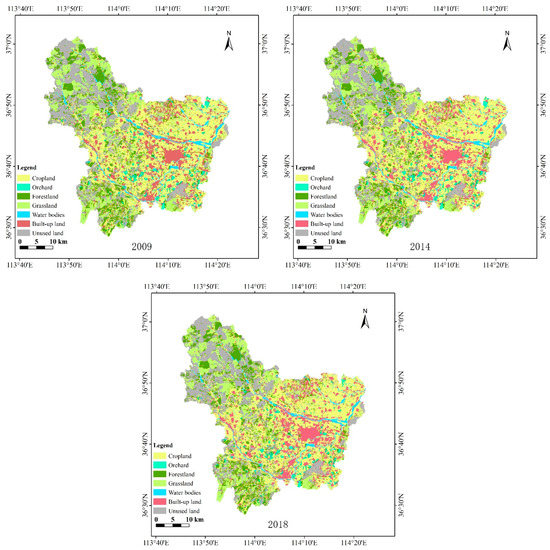 The LUCC data were obtained from a national land use survey by the Wu’an Land Resources Bureau, and this study used three periods of data from 2009, 2014, and 2018 for ESV assessment and spatial change analysis. According to the “technical regulation of the third nationwide land survey”, the land uses were divided into six primary types: cropland, orchard, forestland, grassland, water bodies, built-up land, and unused land. The quantitative relationship in Table 1 and the spatial distribution was shown in Figure 2.