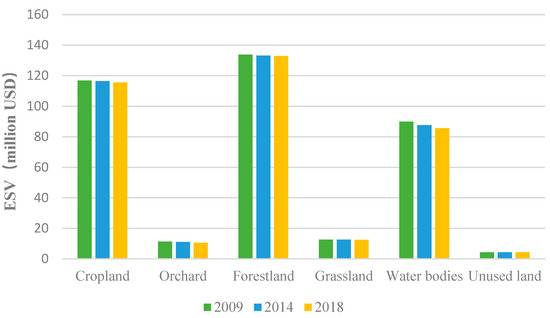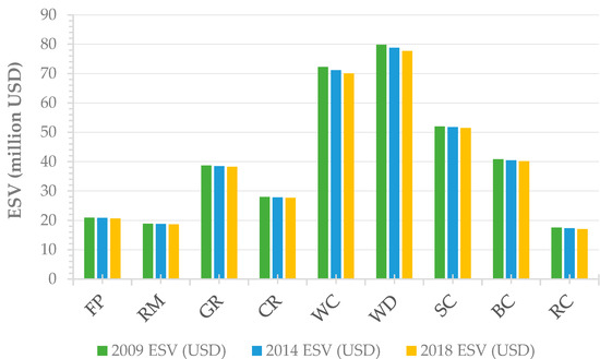 The ESV for different ecosystem service types in Wu’an city from 2009 to 2018.