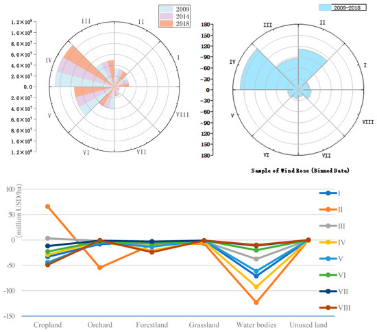 From 2009 to 2018, the farmland ESV increased in the second and fourth quadrants and decreased in other quadrants, of which the ESV increased by 657,609.83 (USD·ha−1·a−1) in the second quadrant. The orchard ESV decreased in all eight quadrants and decreased the most in the second quadrant, which was 545,366.32 (USD·ha−1·a−1). Both forestland and grassland ESV decreased in eight directions, and the decrease was relatively uniform. The water bodies ESV decreased the most, reaching 4,269,624.41 (USD·ha−1·a−1), in the second quadrant and the fourth quadrant decreased the most. Unused land increased and decreased, and the total ESV decreased by 10,684.73 (USD·ha−1·a−1) (Figure 6).
