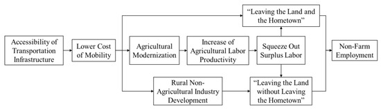 Specifically, on the one hand, rural laborers’ participation in non-agricultural employment is motivated by a high salary [24]; on the other hand, laborers take into account the cost of participating in non-agricultural employment, including the mobility cost, the time cost between urban and rural areas, the search costs of looking for work, the psychological cost of leaving agriculture and moving away from family members, and the economic cost of taking care of family members or accompanying personnel that are left behind [22]. Therefore, the impact of the accessibility of transportation infrastructure on non-agricultural employment can be summarized in three aspects, as shown in Figure 1. Firstly, the accessibility of transportation infrastructure reduces the mobility cost of rural laborers and greatly shortens the time–space distance between urban and rural areas, which reduces the resistance of labor force transfer to cities. This situation of non-agricultural employment in other places is referred to as “leaving the land and the hometown.” Secondly, transportation infrastructure construction promotes agricultural growth [25] and has a spatial spillover effect [26,27]. According to research, the developed road traffic promotes the cross-regional operation of agricultural machinery [28], improves the efficiency of agricultural production [29,30], and reduces the demand for labor factors while promoting agricultural modernization [31]. The surplus labor force considers non-agricultural employment by comparing the expected benefits of non-agricultural and agricultural employment [32]. Thirdly, the accessibility of transportation infrastructure reduces transportation costs and transaction costs, which attracts industrial development [33] and agglomeration [34,35], alleviates the problem of resource misallocation, and adjusts the industrial structure [36]. It not only drives enterprises to land in rural areas, but also facilitates villagers to develop characteristic industries such as tourism and homestays based on the advantages of rural geographical locations and resources [37]. Therefore, while saving the cost of mobility, it also reduces the cost of job search and the psychological construction cost of leaving the homeland. This non-agricultural employment situation among rural laborers is called “leaving the land without leaving the hometown.”