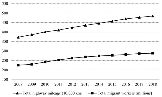 Transportation infrastructure construction and non-agricultural employment of rural residents. Note: The total highway mileage data come from the 2019 China Traffic Yearbook, and the total migrant worker data come from the 2013 and 2020 national migrant worker monitoring and investigation report of the National Bureau of Statistics. The horizontal axis in the figure is the year.