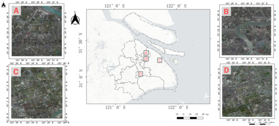 The case city, Shanghai, has set the goal to become a more ecologically integrated and livable city in its latest master plan [48,49]. According to the Shanghai Statistical Yearbook, Shanghai’s urban green space has grown to 157,785 hectares, accounting for 39.7% of the city’s total land area [50]. In October 2021, the Shanghai satellite map was obtained from Map World [51] via 91 Satellite Image Assistant [52]. The National Platform for Common Geospatial Information Services [53] and the Shanghai Surveying and Mapping Institute [54] provided the map of Shanghai subdistrict. There are three red-green-blue bands in all of the data, with a spatial resolution of about 0.51 m. We chose four representative regions to evaluate and compare the model predictions, as shown in Figure 2, because the distribution of green space in Shanghai changes with building density [55,56,57]. Table 1 shows the specific details for each region.
