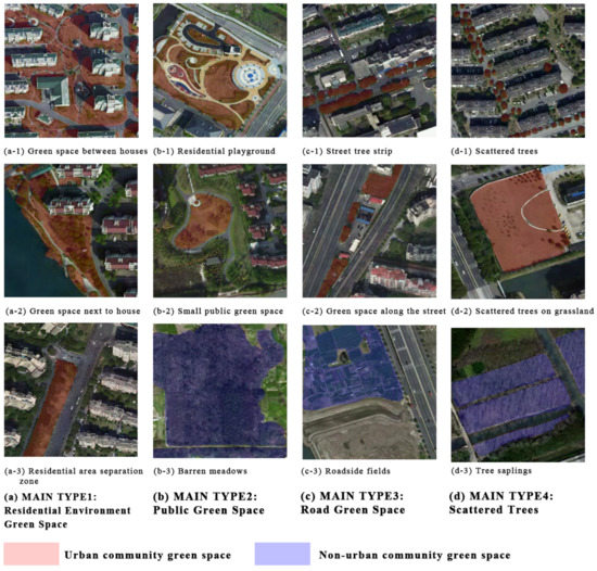 The Ministry of Housing and Urban-Rural Development of the People’s Republic of China (MOHURD) [59] released the national garden and park urban standard in the year 2000 [60]. We focused on urban green spaces that are closely linked to people’s daily lives, and made a more detailed and precise classification of urban community green spaces according to the document. Figure 3 shows examples of UCGS, including green space between houses (a-1), green space next to houses (a-2), residential area separation zones (a-3); public green space including residential playgrounds (b-1), small public green spaces (b-2); road green spaces including street tree strips (c-1), green spaces along the street (c-2) and scattered trees (d-1, d-2). It is important to note that UCGS does not include barren meadows (b-3), roadside fields (c-3), or tree saplings (d-3).