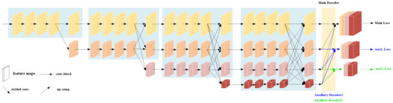 The main decoder head and auxiliary decoder heads were used in parallel. Auxiliary learning aims to achieve deep supervision, a well-known technique for improving performance [68]. The auxiliary decoder aids in learning optimization and was removed during the inference phase [69]. Therefore the extra auxiliary decoders did not increase the inference cost. By adding an auxiliary decoder to the HRNet backbone’s low-resolution subnets, we can improve the low-resolution subnets’ classification performance, making their semantic information more accurate. As a result, by fusing features with the low-resolution feature map, the high-resolution feature map can obtain more accurate semantic information, boosting the high-resolution feature map’s discriminative capabilities.