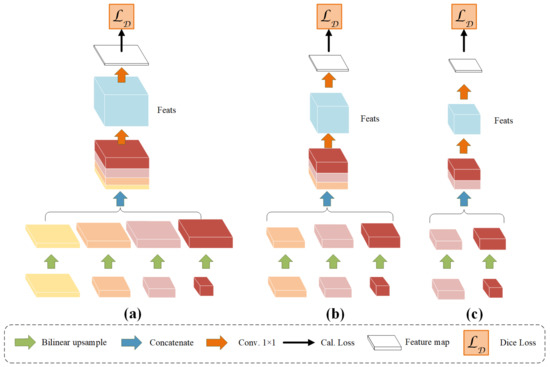 HRNetV2 [66] was originally proposed for semantic segmentation by estimating segmentation maps from a combined high-resolution representation. In Figure 5a, HRNetV2 is adopted as the main decoder in training and inferencing. The method of HRNetV2 is as follows: (1) rescale the low-resolution representations through bilinear upsampling without changing the number of channels to high resolution; (2) concatenate the (upsampled) representations from all the resolutions; (3) a convolution mixes the four representations and gains the feats; (4) the loss is calculated by comparing the classification results obtained from feats by convolution with ground truth.