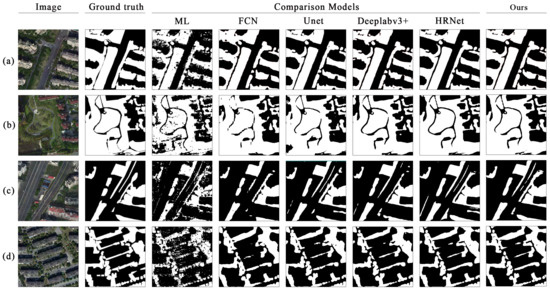 The classification ability of the model in this paper was the best. In terms of evaluation metrics, our model outperformed HRNetV2 with the HRNet-W48 backbone by 0.7 points in IoU, 0.46 points in F1-score, and 0.39 points in OA. Even when compared to HRNetV2 with HRNet-W18 as the backbone, our method outperformed it. Our model reduced misclassifications in terms of classification outcomes. For example, HRNet misclassified a road as green space in Figure 6c, whereas our classification results have no such problem. The auxiliary segmentation decoder, in addition to the main segmentation decoder, contributed to our model’s excellent performance. By adding two auxiliary decoders in training, the model in the paper paid greater attention to low-resolution subnets with richer semantic information than HRNetV2. When multi-resolution subnets exchange data, low-resolution feature maps can contribute more accurate semantic information to high-resolution subnets, thereby boosting the accuracy of high-resolution representations.
