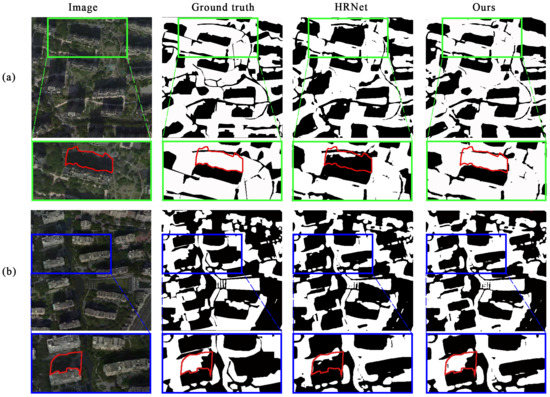 As seen in Figure 7, our model performed significantly better than HRNet in identifying shaded green patches. In Figure 7, for example, the green area surrounding high-rise housing is frequently obscured by the shadows of high-rise structures. The shaded green space behind the building was recognized by our approach in Figure 7a, whereas the HRNet misclassified the shade as a non-UCGS. In Figure 7b, HRNet only identified a portion of the shaded green space. Our approach, on the contrary, recognized the full green space. Despite the fact that our model didn’t entirely detect the outline of green patches obscured by shadows, it was a significant improvement over HRNet.