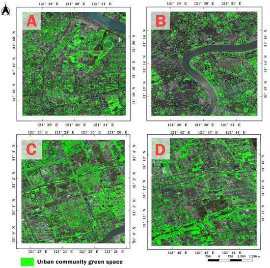As is illustrated in Figure 8, green space was mapped on four representative study areas with a high density of urban communities, including downtown and suburban region. Area A is mainly located in Baoshan district. The land cover of Baoshan district is predominantly residential communities, including some urban green spaces and parks. It is worth noting that the barren meadow in the green space in the up-right corner of area A was not mistaken for green space, which verifies the accuracy of our model. Area B represents the business area and covers the busiest area of Shanghai, including the Bund and part of Huangpu River. The shadows of the tall buildings covering part of the green space in these regions add to the difficulty of our task, which is also an unresolved problem for many traditional methods of green space classification. However, taking the center area of B featuring long and large-scale shadows as an example, our model precisely identified the green space surrounded by tall buildings with shadows on it. Area C is located in Minhang District, a typical industrial area with many communities. It is clear that green vegetation on the roofs and the green plastic playgrounds in schools are not misidentified as green space using our model. Area D, situated in Pudong new area, has relatively large farmland areas, so it stands for the agricultural area. Our model succeeded in distinguishing farmlands from the residential green space that we are interested in, making it also possible to be used in extracting community green space in suburban regions.