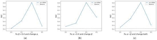 We designed three experiments to see how the weight of the auxiliary task affected the overall task and the primary task. The weights of the losses created by the two auxiliary decoders in the total task, according to Equation (2), are and . We first set equal to 0.4, then varied the value of and watched the trained model’s performance. Figure 9a depicts the result. We also fixed , changed , and did the same comparison experiment. The result is shown in Figure 9b. Figure 9c depicts the result of setting equal to and modifying both of them at the same time. All of the experimental results suggest that the weight of the auxiliary task has an impact on the model’s performance. Regardless of the weights, aux-HRNet outperforms the methods without auxiliary learning. Appropriate weights for the auxiliary tasks should be chosen when utilizing the aux-HRNet model for various activities.