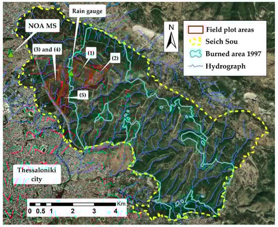 - Forest Research Institute of Thessaloniki. Installation of a System for Monitoring the Developments in the Suburban Forest of Thessaloniki (Seich Sou) and Preparation of a Study for the Selection of Forest Species in Fire-Affected Areas; Forest Research Institute of Thessaloniki: Thessaloniki, Greece, 2001. [Google Scholar]