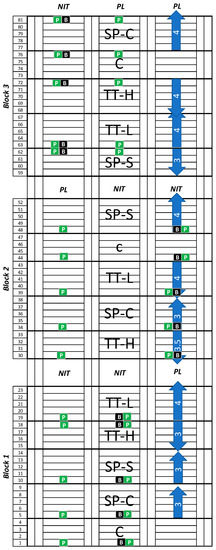 Experimental plan with a two-factor strip-plot design. The two tested tillage methods, ploughing or inversion tillage (PL) and non-inversion tillage (NIT) were whole plot (three per block-vertical) treatments. The slurry application methods, self-propelled slurry spreader, in crab steering (SP-C) and in standard steering (SP-S), and tractor-trailer combination, with inflation pressure that is recommended for road traffic (TT-H) and at a level recommended for field traffic (TT-L), each were repeated once per block (horizontal). The traffic of all slurry application methods was done wheel-to-wheel, with the intent of driving over the entire area of each plot. The control (C) plots remained un-trafficked. The blue arrow indicates the sequence of passages per treatment and the number inside corresponds with the number of passages needed to drive over the entire plot. The numbering on the left of the plan (1–81) shows each passage during sowing. These passages all had a width of 2.7 m. The B in a black square and the P in a green square indicate the location of, respectively, the collected soil samples and the measurement of penetration resistance.