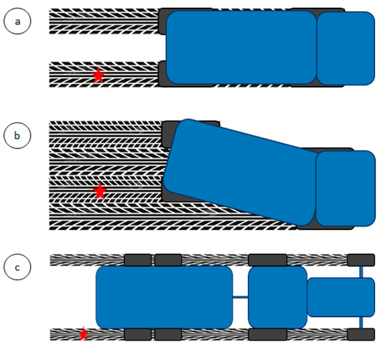 Conceptual drawings of the tested slurry application methods, showing the two steering modes of the self-propelled slurry spreader, i.e., standard steering, SP-S (a) and crab steering, SP-C (b) and the tractor-trailer combination with both high and low tyre inflation pressure, TT-H and TT-L, respectively (c). The red star locates the position where the undisturbed soil samples were taken, and the penetration resistance was measured. This position corresponds with the centre of the tyre track that was driven over by, at least, the rear axle.