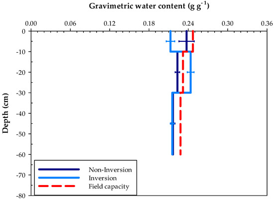 Average gravimetric water content during experimental traffic for non-inversion (dark blue) and inversion (light blue) plots ± standard deviation (n = 4) for three depth intervals (0–10, 10–30 and 30–60 cm). The given field capacity (−10 kPa-red) was determined for the non-inversion plots. The horizontal axis is scaled from 0 up to gravimetric water content at saturation (0.36 g g−1).