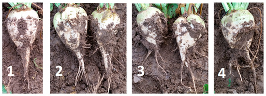The crop parameters were determined in September 2019. Firstly, 18.9 m2 was manually harvested to determine the percentage of deformed sugar beets. This was done in four and five plots for the ploughed and non-inversion tillage plots, respectively. The sugar beets were visually divided into four predefined classes based on the shape of their roots (KBIVB). Figure 4 shows an example for each of the four classes. The sugar beet roots in class 1 had an unbranched taproot. Class 2 was characterized by small root branches at the tip of the taproot, Class 3 by moderate splitting of the taproot and Class 4 by the absence of a clear taproot and strong splitting. In accordance with KBIVB procedure, classes 3 and 4 can be defined as seriously deformed. Further analysis of root deformation will therefore focus on the proportion of these two classes. Later, 18.9 m2 was harvested in five plots for both the ploughed and non-inversion tillage sections. The sugar beets were weighed after washing. A selection of the harvested sugar beets was then analysed for sugar content. Sugar content and total weight of sugar beets harvested were used to calculate total sugar yield, for which the farmer is actually paid.