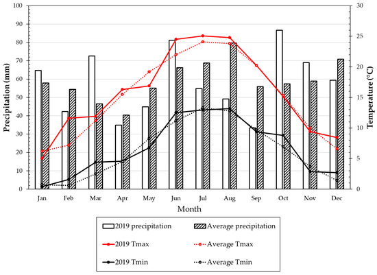 Precipitation (mm), maximum temperature (Tmax-°C) and minimum temperature (Tmin-°C) in Landen for the experimental period (January–December 2019) and the 1991–2020 average.