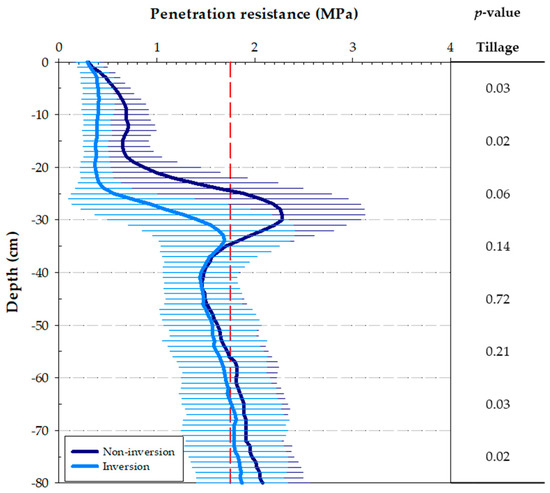 Average penetration resistance (MPa) ± standard deviation (n = 165) between 0 and 80 cm depth after tillage (non-inversion: dark blue; inversion: light blue), but before experimental traffic. The red dashed line represents the threshold values for sugar beet root growth (1.75 MPa).