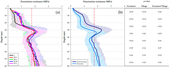 Even after experimental traffic the differences in PR between the tillage methods remained significant (p < 0.05) in the topsoil, with non-inversion tillage showing the highest values. The statistical analysis did also show a significant interaction between both tested factors for most of the depth intervals. When plotting PR of the slurry application methods and un-trafficked control per tillage method (Figure 8), it can be seen that the method of slurry application had a higher impact after inversion tillage in comparison with non-inversion tillage. This effect though was only significant in the topsoil of the inversion tillage plots. The difference in PR between SP-S and SP-C was clearer for inversion tillage. The opposite was true for TT-L and TT-H, with TT-L even resulting in higher topsoil PR than TT-H for inversion tillage.