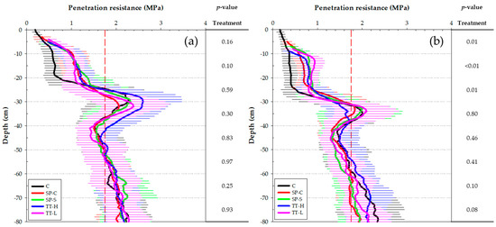 In Figure 7, PR after experimental traffic is presented, with Figure 7a showing the effects of the slurry application methods and the un-trafficked control (treatment), while Figure 7b displays the effects on the two tested tillage methods. The values shown were adjusted to take the rut depth into account. The statistical analysis pointed out that the experimental traffic treatments had a significant effect on PR down to 80 cm. In the top 20 cm all four slurry application methods significantly (p < 0.05) increased the PR compared to the un-trafficked control. Treatment SP-C had a significantly reduced impact compared to SP-S: −14% (0–10 cm) and −10% (10–20 cm), while it also showed a strong trend (0–10 cm: p = 0.06; 10–20 cm: p = 0.06) towards reduced impact compared to TT-L: −12% (0–10 cm) and −9% (10–20 cm). Deeper into the soil profile no significant increases in PR were caused by SP-C and TT-L, in contrast with SP-S and TT-H, which still showed significant PR differences between 20 and 30 cm depth. At this same depth interval TT-L showed a strong trend (p = 0.05) towards reduced impact (−13%) on PR compared to TT-H. Between 20 and 70 cm depth the highest average PR was measured for TT-H. Between 70 and 80 cm depth, the PR for TT-H was lower than that of the un-trafficked control, just like the other treatments, which did not differ much from each other. The un-trafficked control, SP-C and TT-L all surpassed the threshold value of 1.75 MPa for restriction of sugar beet root growth at 30 cm depth. For SP-S this was at 29 cm and for TT-H at 28 cm depth.