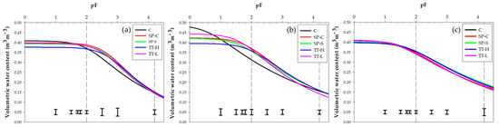Water retention curves for the control and the four experimental treatments at 5 cm (a), 20 cm (b) and 45 cm (c) depth (n = 3). The dashed lines indicate field capacity (pF = 2.0) and permanent wilting point (pF = 4.2). The vertical bars represent repeated-measures LSD (5%) values for the matric suctions at which the water content was determined: 1, 3, 5, 7, 10, 33, 100 and 1500 kPa.