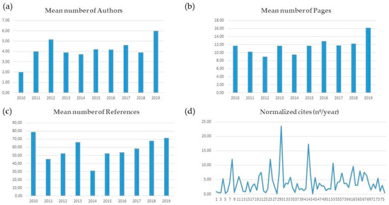 Time trends in scientific production over the last decade on protected areas’ ecological effectiveness: (a) mean number of authors per year; (b) mean number of pages per year; (c) mean number of references contained in articles published each year; (d) normalized citations of each article, from 1 (2010) on the left on the x-axis to 76 (2019) on the right.