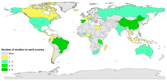 The scientific production on the effectiveness of PAs between 2010 and 2019 focused on terrestrial PAs. These accounted for 66% of the selected articles, compared with 25% that studied MPAs. Articles analyzing coastal ecosystems were the minority (slightly less than 10%). The countries to which the greatest numbers of articles refer (Figure 4) were Spain and China (8 articles each), followed by Brazil (6) and Tanzania (4). On the other hand, our results show that PAs of maximal protection (IUCN categories I and II) attracted most of the research (50% of the articles analyzed).