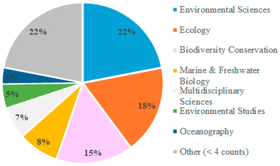 Just over 30% of the articles were published in journals indexed in the Directory of Open Access Journals (DOAJ). Among them, four articles were published in PLoS One, three in Conservation Letters, two in Scientific Reports, two more in Ecology and Society, and one in Global Ecology and Conservation. Over 55% of the articles were published in three journal categories: Environmental Sciences, Ecology, and Biodiversity Conservation (Figure 6).