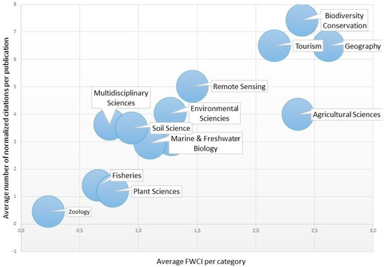 Articles published in journals belonging to the categories Biodiversity Conservation, Geography, Tourism, Remote Sensing, and Agricultural Sciences achieved the highest normalized number of citations (Figure 7) while obtaining considerably more citations than expected compared with other similar papers (FWCI index). On the contrary, articles published in journals included in the categories Zoology and Fisheries obtained worse results in terms of research impact if we consider normalized citations, FWCI, and normalized usage counts. In an intermediate position was the group of studies published in the Multidisciplinary Sciences category. They achieved an average of 3.63 citations per year but obtained fewer citations than expected (FWCI = 0.75).