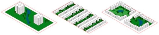 Hampering the pursuit of the above stated objective, current studies of city compaction suffer from a lack of coherent measurements of both density and its associated environmental benefits [111]. For example, three substantially different conceptualizations of urban density exist in the literature: population density, building density, and growth boundaries, each measured in different ways and at different spatial scales. This means that comparison between studies and a cumulative development of proof are difficult to attain. Furthermore, urban form can take on various shapes using the same building density [117], and a combination of various density measures is needed to distinguish different urban form types. The differences in the composite of density measures make a great deal of difference for what social and ecological services urban form can provide (Figure 4).