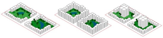 Three urban types (point, street, and perimeter block) with the same density (floor space index = 0.75) display differences in other density measures, as revealed in spacematrix analysis (e.g., ground space index, building height, open space ratio), as well as differences in green space ratio and parcel density (i.e., institutional configuration).