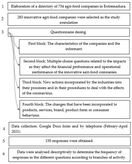 The information that can be obtained on the innovative activities of companies in Spain (mainly, Statistics on R&D Activities [77] and the Business Innovation Survey of the Spanish National Statistics Institute, NIS [78]) is at the national level. Data corresponding to Extremaduran companies is scarce, especially data referring to a specific sector of activity. In addition, information is offered for companies with more than 10 workers, with micro-companies (companies with less than 10 workers) being the main size of the business fabric in the region. The scarcity of information on agribusiness in Extremadura led to the creation of a bespoke database that constituted the starting population. Figure 1 shows the stages of the research design.