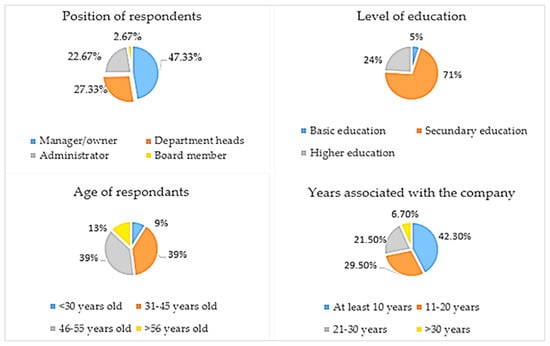 As previously indicated, the final sample included 150 innovative agri-food companies. Most of the informants were company managers/owners (47.33%), followed by department heads (finance, quality, R&D, operations, sales) (27.33%) and administrators (22.67%). The education level of the informants was mostly secondary education (70.7%), followed by higher education (24%) and basic education (5.3%). Regarding the age of the informants, 8.7% were under 30 years old; 38.7% were between 31 and 45 years old; 39.3% were between 46 and 55 years old; and 13.3% were over 56 years old. The predominant age of the informants was in the range of 31–55 years (Figure 2).
