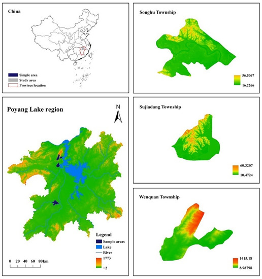The Poyang Lake region is located in the northern Jiangxi Province, China. It is an important hub connecting the south and north as well as the coast and the interior. Our study area covers 51,200 km2, which is at a high elevation at the periphery and low in the middle; mountains, hills, and plains account for about 36%, 42%, and 22% of the total area, respectively. The area is an important commercial grain production base of China, where the main crop is rice, which accounts for more than 50% of the total cultivated area of crops in Jiangxi Province [40]. However, the investment of agricultural production is not sufficient, and grain productivity is low.