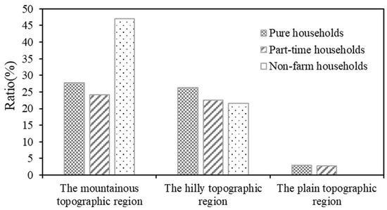 Characteristics of cropland abandonment by diverse farming households in different topographic regions are shown in Figure 2. The probability of cropland abandonment is 18.5% in the Poyang Lake region. The abandonment probability of non-farm households is generally the largest, followed by part-time households, and pure households (19.7%, 17.0%, and 13.6%, respectively). However, there are significant differences among different topographic regions, with the abandonment probability in the mountainous region being largest for non-farm households, followed by pure households and part-time households. The abandonment probability in the hilly and plain regions is largest for pure households, followed by part-time households and non-farm households. In addition, the abandonment probabilities of all types of households in the plain region are significantly lower than that of households in other topographic regions.